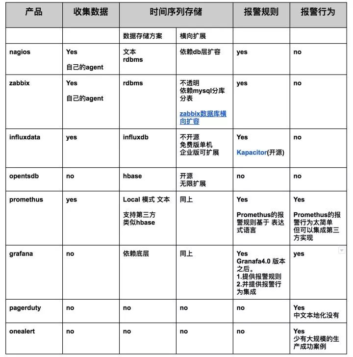 我整理了一张表,描述常见的“监控报警”领域的开源产品,落在哪个区间: