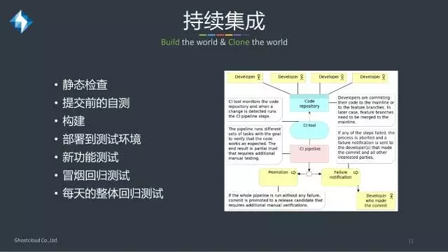 持续集成一个主要的功能是让每个工程师的代码提交都不会影响到Mainline,以保证Mainline的可发布状态。实施持续集成时,需要注意的地方:指定规则,提交代码时要一并提交新功能的测试用例。