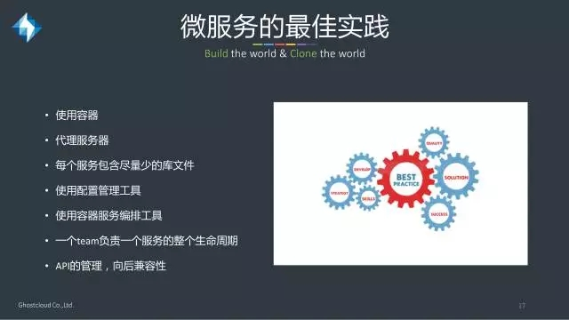 在微服务的最佳实践中,首先不得不提容器。容器的轻量化让微服务启动很快,同时容器的跨平台性保证了微服务可以在不同的平台启动起来。第二种是使用代理服务器来访问微服务,现在最常见的方式是前端连接一个代理服务器,后端再连接运行同一个微服务的几个相同容器。一个大的应用会使用几十上百个微服务,和微服务不相关的库文件不建议放在容器中。实践微服务中,建议使用配置管理工具(ansible, puppet等)和容器服务编排工具(K8s,Swarm,EcOS等)。