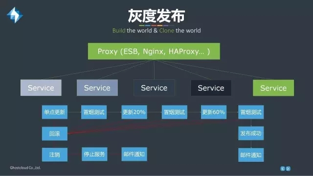 如果一个服务由多个相同的容器运行,灰度发布则先对其中的部分容器先进行升级,可混合让老版本和新版本的容器同时提供服务。如发现新服务没有什么问题,则可以把所有剩下的微服务再全部进行升级。