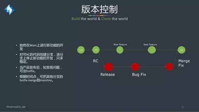 DevOps下版本控制的原则是始终在Mainline上进行新功能的开发,并经由持续集成的自动化测试对代码进行验证。当功能开发到一定阶段的时候,对可RC的代码创建分支,该分支上停止新功能的开发,只求稳定。当产品发布后,如发现问题,可出hotfix。根据时间点和具体需要,可把其他分支的hotfix merge到Mainline上。
