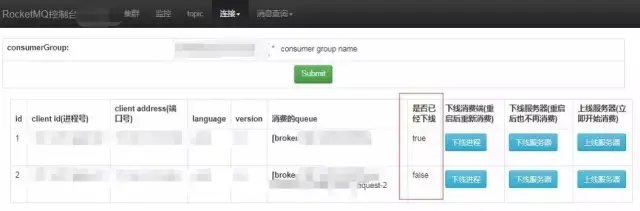 同理,如果要被重启的APP机器正在消费消息队列中的消息,也需要等消费完成后才能进行发布,因此需要查询该APP机器所对应的Consumer Group及绑定的Queue,然后下线,即解除绑定。在RocketMQ的web-console中我们增加了对应接口,进行下线。