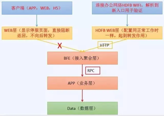 先分享下我们的做法,我们会在办公网络单独申请一个HDFB的wifi(灰度发布),然后当你连上这个wifi出公网解析时,所有和我们业务相关的域名会解析到另一个入口,这个入口对应一个灰度发布的WEB层,配置和线上一模一样,限制只能办公网络访问,所有人员在办公室通过这个入口即可访问和验证新版本,但公网用户不可达。