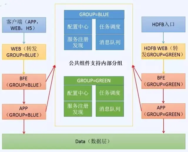 确认无误后,重复上述步骤,增加GROUP=GREEN机器比例,当超过一半时,GROUP=GREEN直接提供线上服务,即把线上WEB层直接指向BFE(GROUP=GREEN)的分组。