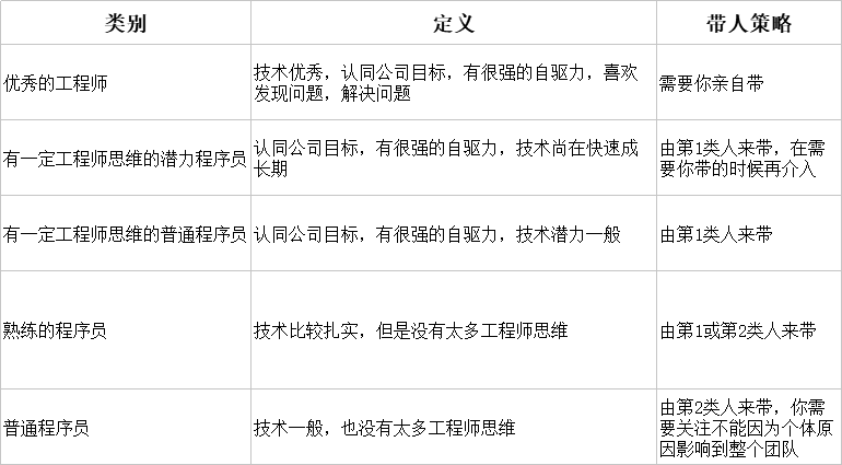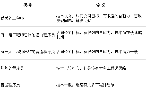 一般来说,对于一个技术团队我会把成员分为如下类别: