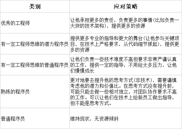 简单来说,所谓的用人策略就是:如何定义人的角色、如何安排事务、如何安排资源的综合计划。有一个关键点是集中你的精力做好最关键的事,把精力放在真正需要关心的人身上。团队越大,对你精力的挑战越大,曾经有一种说法是“你能高效直接管理的只有6个人。”不是没有道理的。