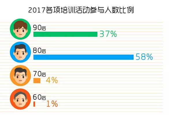 下面是一个互联网公司统计的公司培训参与人数的比例,可以看到现在的学习主力已然是80后、90后。大家主动学习的热情都这么高,也是一种无形的竞争。
