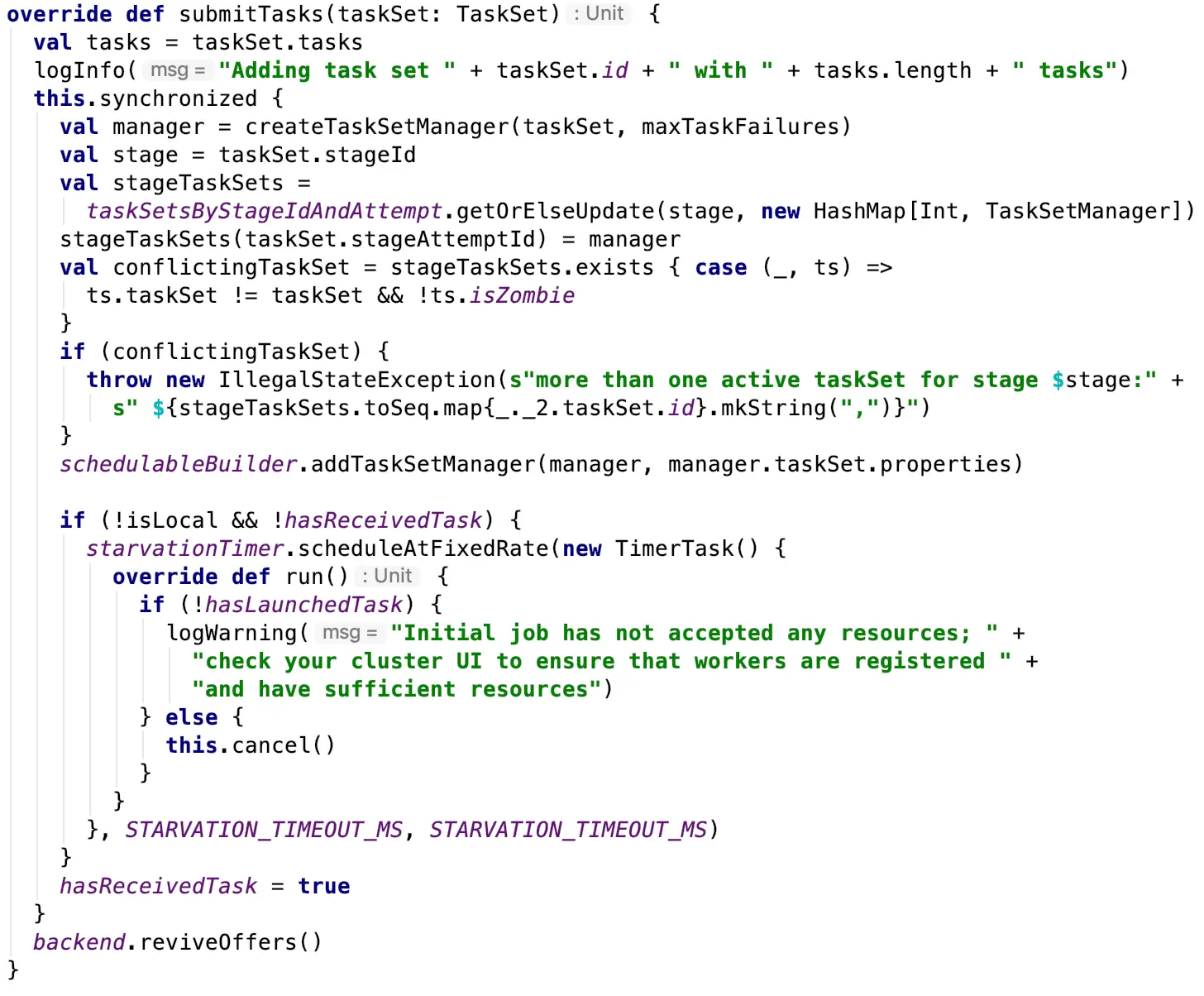 TaskScheduler的具体实现类为TaskSchedulerImpl,其中有一个方法为submitTasks非常重要,该方法源码如下所示: