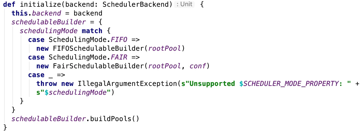 initialize方法当中还会创建一个Pool来初始定义资源的分布模式Scheduling Mode,默认是先进先出(FIFO)模式,还有一种支持的模式是公平(FAIR)模式。FIFO模式指的是任务谁先提交谁就先执行,后面的任务需要等待前面的任务执行,FAIR模式支持在调度池中为任务进行分组,不同的调度池权重不同,任务可以按照权重来决定执行的先后顺序。