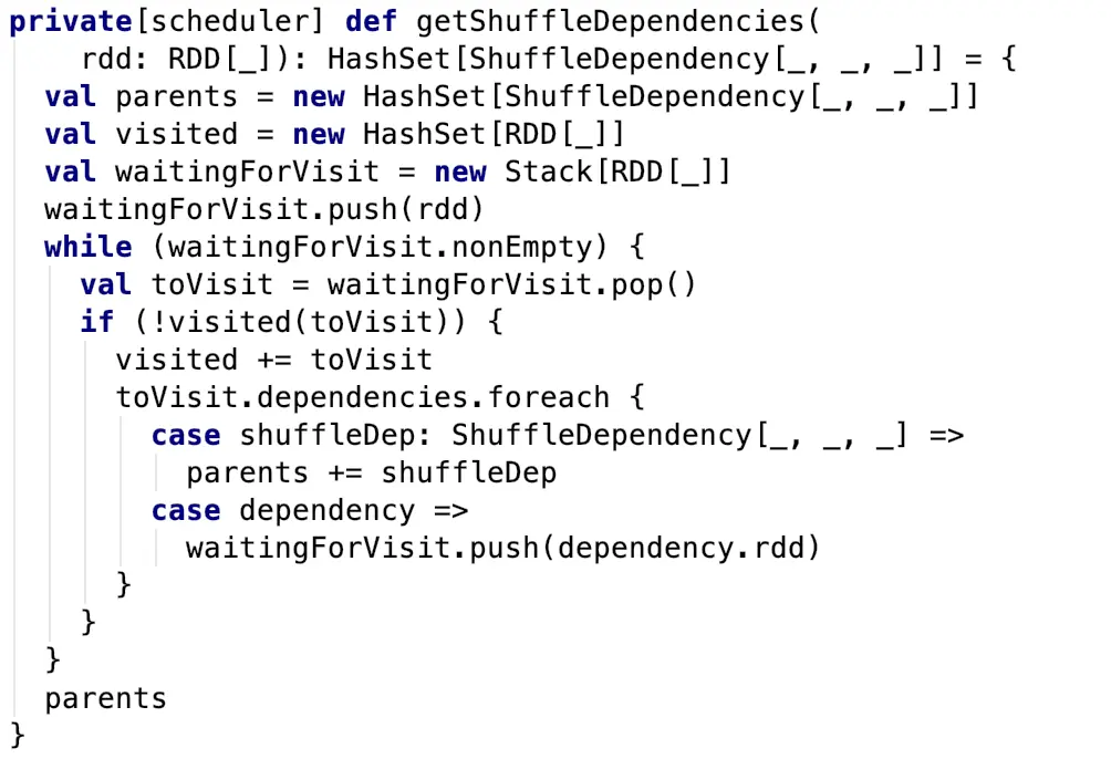 其中调用了一个函数getShuffleDependencies用来返回给定RDD的父节点中直接的shuffle依赖,其源码如下:
