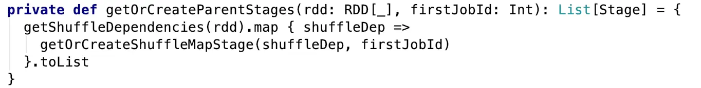 JobSubmitted会去调用DAGScheduler中的handleJobSubmitted方法,该方法是构建Stage的开始阶段,会创建Stage中的最后一个Stage——ResultStage,而其他Stage为ShuffleMapStage。ResultStage的创建是由createResultStage这个函数完成的,其中的getOrCreateParentStage方法将会获取或创建一个给定RDD的父Stages列表,这个方法就是我们之前所说的具体划分Stage的方法,这个方法的源码很简单,如下: