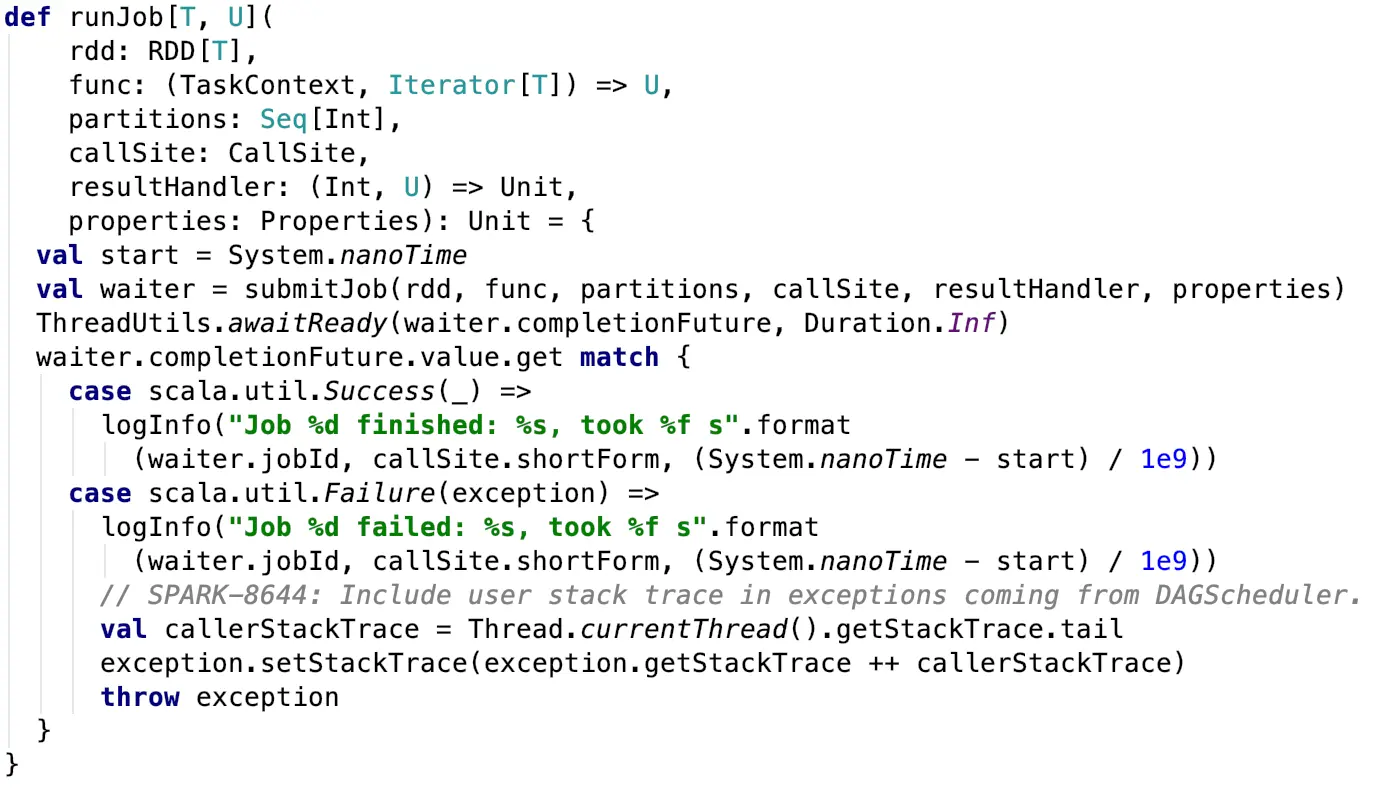 当一个job被提交时,DAGScheduler便会开始其工作,spark中job的提交是由RDD的action触发的,当发生action时,RDD中的action方法会调用其SparkContext的runJob方法,经过多次重载之后会调用到DAGScheduler的runJob方法。 DAGScheduler类当中runJob是提交job的入口函数,其中会调用submitJob方法返回一个JobWaiter来等待作业调度的结果,之后根据作业的成功或者失败打印相关的结果日志信息。
