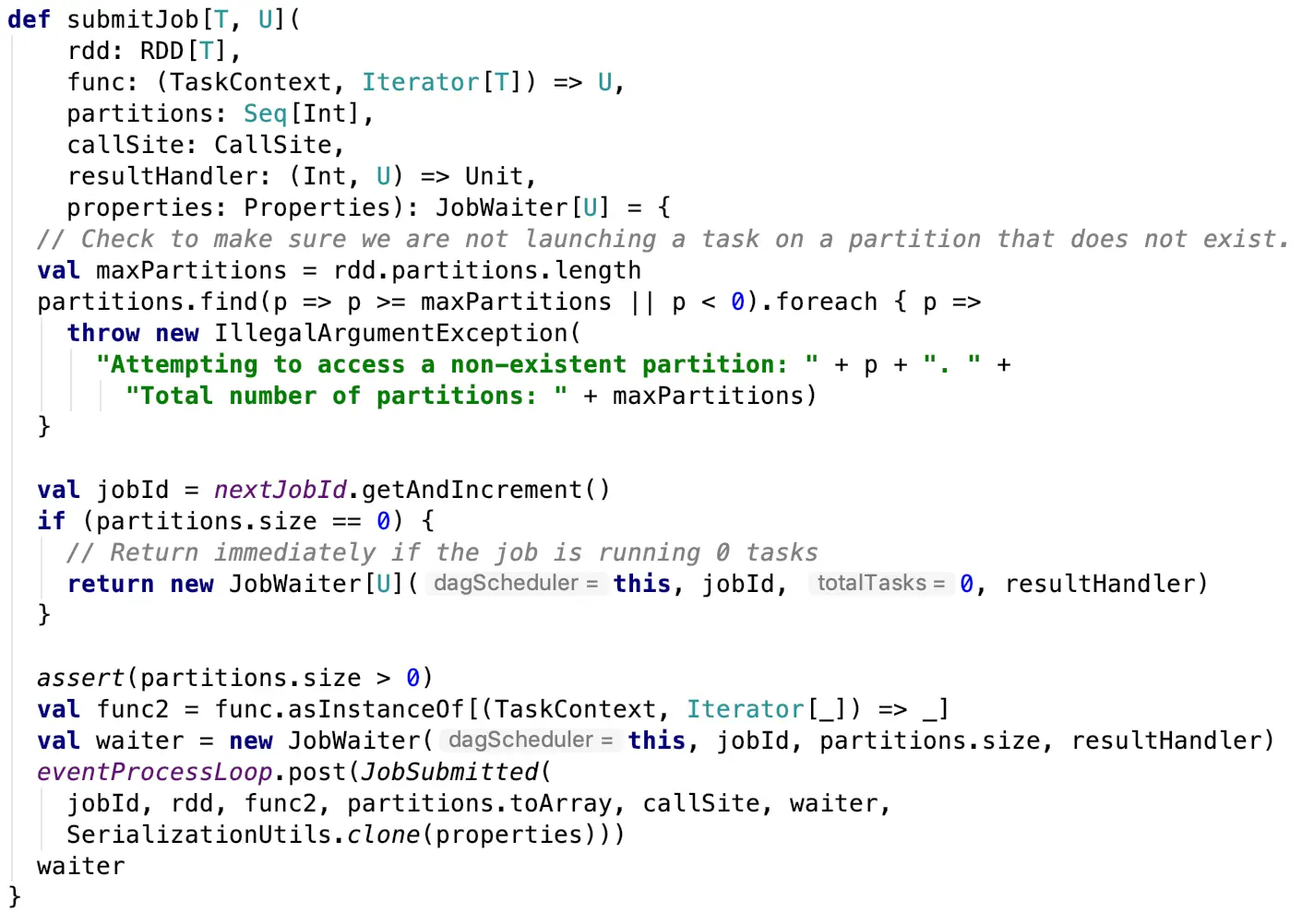 submitJob方法会获取jobId以及校验partitions是否存在,并向eventProcessLoop发送了一个case class JobSubmitted对象,JobSubmitted对象封装了jobId、最后一个RDD,对RDD操作的函数,哪些partition需要被计算等内容。eventProcessLoop当中有一个eventThread线程,是一个deamon线程,用于接收通过post方法发送到该线程的JobSubmitted对象,放入其中的一个eventQueue阻塞队列进行处理,从eventQueue中take出来的event会调用onReceive方法(该方法由eventProcessLoop实现),onReceive方法中又会调用doOnReceive方法,按照不同的event类型进行不同的处理。 这里读源码的时候可能会有一个疑问,为何不直接在DAGScheduler调用submitJob的时候直接调用doOnReceive来处理job,为何要新启一个线程来进行处理,并且自己给自己发消息进行处理(eventProcessLoop是DAGScheduler内部的一个对象)。这里实际上是一个线程的异步通信方式,只是将消息以线程通信的方式post(这里的线程通信方式实际上是用了一个阻塞队列)给另一个线程,submitJob的方法能够立刻返回,不会阻塞在处理event的过程当中。这里我们不要浅显的认为DAGScheduler当中自己在给自己发消息,实际上还有别的组件会给DAGScheduler发消息,这种采用一个守护线程的方式进行消息处理可以将这两者统一起来,两者处理的逻辑都是一致的,扩展性非常好,使用消息循环器,就能统一处理所有的消息,保证处理的业务逻辑都是一致的。这里的eventProcessLoop实际上能够处理多种消息,不仅仅是JobSubmitted,源码当中能看到有如下多种event的处理:
