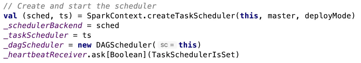 SparkContext的核心作用是初始化Spark应用程序运行所需要的核心组件,包括高层调度器DAGScheduler、底层调度器TaskScheduler和调度器的通信终端SchedulerBackend,同时还会负责Spark程序向Master注册程序等。Spark应用当中的RDD是由SparkContext进行创建的,例如通过SparkContext.textFile()、SparkContext.parallel()等这些API。运行流程当中提及的向集群管理器Cluster Manager申请计算资源也是由SparkContext产生的对象来申请的。接下来我们从源码的角度学习一下SparkContext,关于SparkContext创建的各种组件,在SparkContext类中有这样一段代码来创建这些组件: