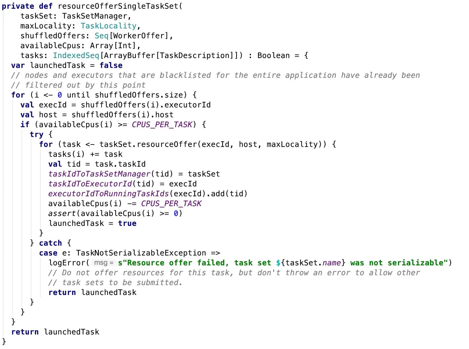 该方法会获取活动的Executor,根据activeExecutor生成所有可用于计算的workOffers,workOffers在创建时会传入Executor的id,host和可用的core等信息,可用的内存信息在其他地方已经获取。makeOffers方法中还调用了scheduler的resourceOffers方法,这个方法便是给用于计算的workOffers提供资源,均匀的将任务分发给每个workOffer(Executor)进行计算。在这里我曾经有一个疑问,就是任务是不是按顺序发给每个Executor进行计算的,即假设有100个Task,5个Executor,分发任务的时候是不是总是按照0号Executor、1号Executor、2号Executor……这样的顺序进行分发的,也就是0号Executor总是拿到id为TaskId % 5的任务,1号Executor总是拿到id为TaskId % 5 + 1的任务。但阅读源码发现,其中有一个环节是进行shuffle操作,调用的是Random.shuffle(offers),即把workOffers(Executors)在Seq中的顺序进行洗牌,避免总是把任务放在同一组worker节点,这一点我们在后续的resourceOfferSingleTaskSet方法中可以很清楚的看到任务具体分发的过程其实就是按照workerOffers在Seq中的顺序进行的,在源码中就是对workerOffers的一个简单的for遍历进行读取可用的core资源并将可用的资源分发给TaskSetManager用于对应的TaskSet的计算:
