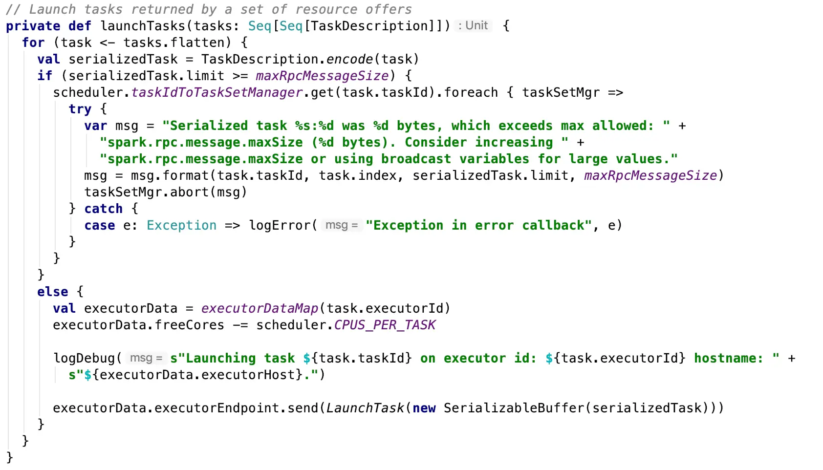 如果任务序列化之后大小超过了maxRpcMessageSize(默认128M)会丢弃,否则根据TaskDescription中记录的执行该Task的executorId获取executorData,将其中的freeCores减去运行任务需要的core数,并使用executorEndPoint的send方法发送LaunchTask给指定的Executor的ExecutorBackend进行执行,LaunchTask是一个case class,其中存储的内容就是序列化的Task。