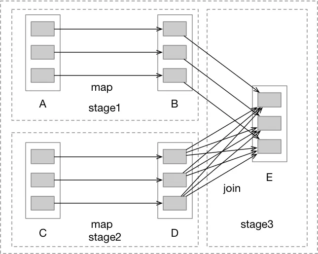 如下图所示是5个RDD的转换图,假设RDD E最后出发了一个action(比如collect),接下来按照图中的关系仔细讲解一下DAGScheduler对Stage的生成过程。