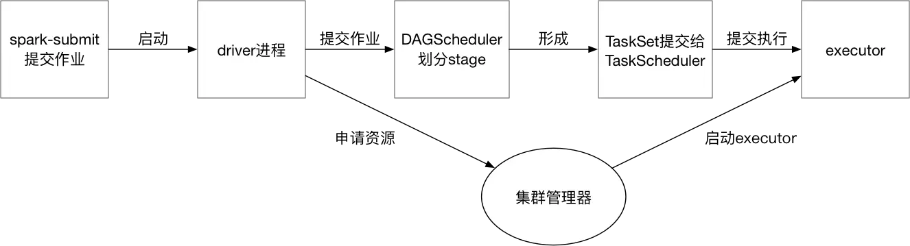 用户使用spark-submit提交一个作业之后,会首先启动一个driver进程,driver进程会向集群管理器(standalone、YARN、Mesos)申请本次运行所需要的资源(这里的资源包括core和memory,可以在spark-submit的参数中进行设置),集群管理器会根据我们需要的参数在各个节点上启动executor。申请到对应资源之后,driver进程就会开始调度和执行我们编写的作业代码。作业会被提交给DAGScheduler,DAGScheduler会根据作业中RDD的依赖关系将作业拆分成多个stage,拆分的原则就是根据是否出现了宽依赖,每个stage当中都会尽可能多的包含连续的窄依赖。每个stage都包含了作业的一部分,会生成一个TaskSet提交给底层调度器TaskScheduler,TaskScheduler会把TaskSet提交到集群当中由executor进行执行。Task的划分是根据数据的partition进行划分,一个partition会划分为一个task。如此循环往复,直至执行完编写的driver程序的所有代码逻辑,并且计算完所有的数据。