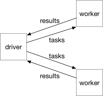driver与worker之间的架构如下图,driver负责向worker分发任务,worker将处理好的结果返回给driver。