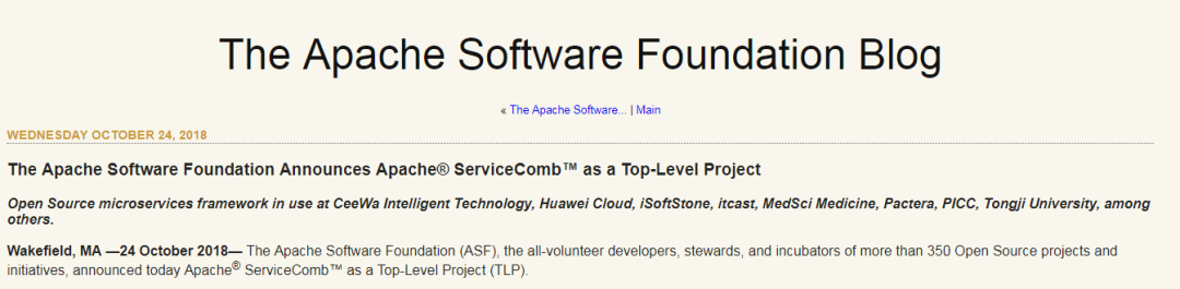 2018年10月,马萨诸塞州,韦克菲尔德 – 完全由志愿开发者组成、管理,旗下孵化器拥有超过350个开源项目的 Apache软件基金会(ASF),今天宣布Apache ServiceComb为顶级项目(TLP)。