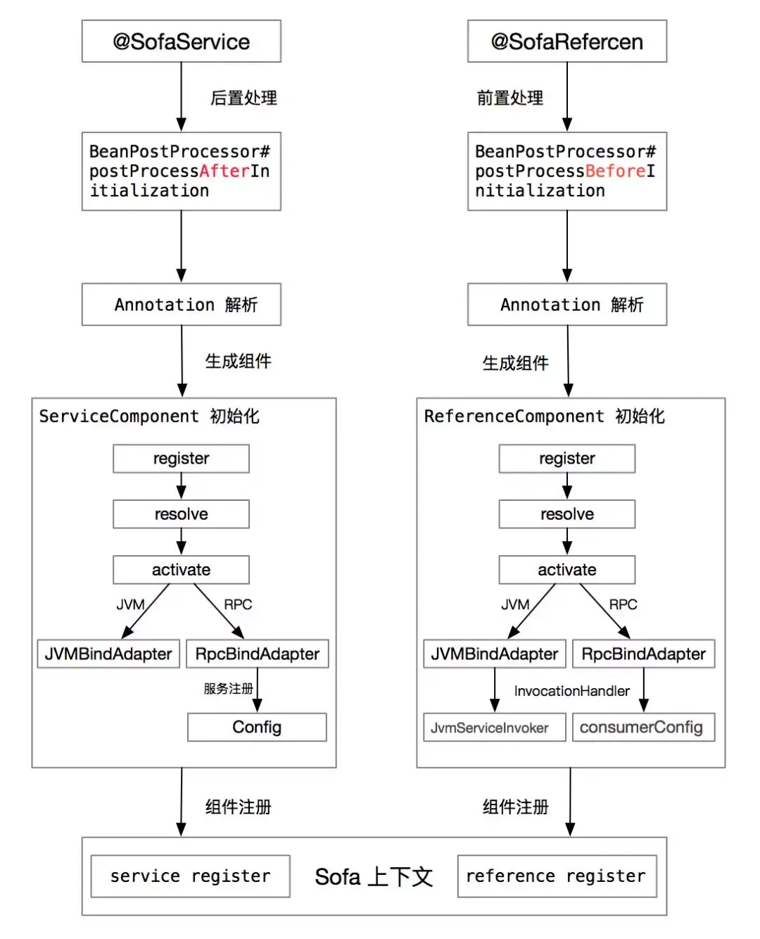 SOFA 实际上是注册了一个BeanPostProcessor 来处理@SofaService 和 @SofaReference注解。需要发布引用的对象属于当前 bean 的实例变量,使用 xml 的方式进行服务发布和引用,可以直接通过 Bean 生命周期的 InitializingBean#afterPropertiesSet 方法进行扩展。在工程中注解扫描是一个对所有 bean 的操作,只能通过实现 spring 的 beanpostprocessor 这个接口,另外有些属性可能在发布时需要用到。