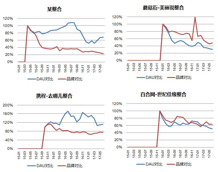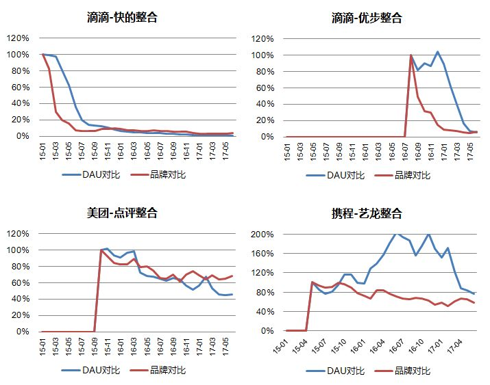 如果将用户量数据和品牌数据放在一个时间维度观察会更有意思,这里使用归一化之后的相对指标,可以看到在各种整合过程及方案下,两个产品的用户量数据以及品牌数据的相对量变化情况。其中灰色区域代表着整合公布之后时间段内的指标变化。