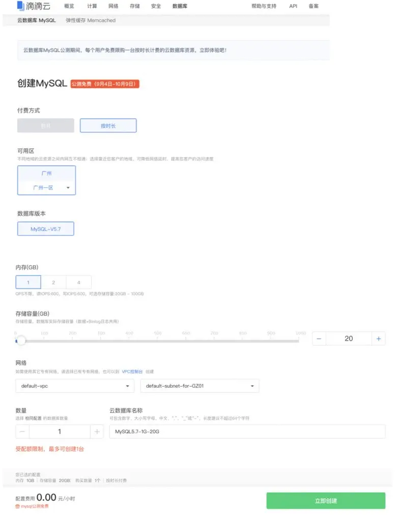 1.付费方式:滴滴云数据库MySQL免费公测期间,仅提供按时长计费的资源;