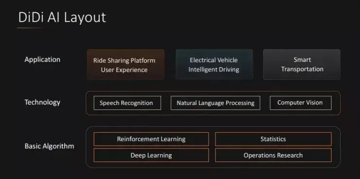 据叶杰平教授介绍,滴滴的 AI 战略和布局主要围绕三个层面展开,最底层是基础的 AI 算法,比如强化学习算法、深度学习算法等;中间一层则是滴滴拥有的非常核心的 AI 技术,如语音、自然语言处理、图像等;而最上一层则是 AI 技术支持的应用—包括用技术创新提高出行平台的用户体验,以人工智能、大数据技术助力城市建设智慧交通网络,布局智能驾驶及新能源汽车等领域。