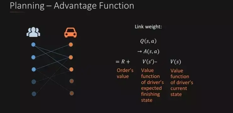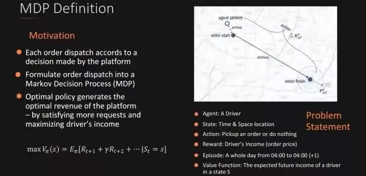 滴滴叶杰平教授还介绍了深度强化学习技术在滴滴智能派单中应用。由于派单的决定会影响未来的司机分布,且派单既要考虑司机收入还要保障用户体验,综合考虑这两个需求,叶杰平教授介绍了两种方法来解决派单问题,一种方法是 MDP(Markov Decision Process),另一种是深度强化学习。