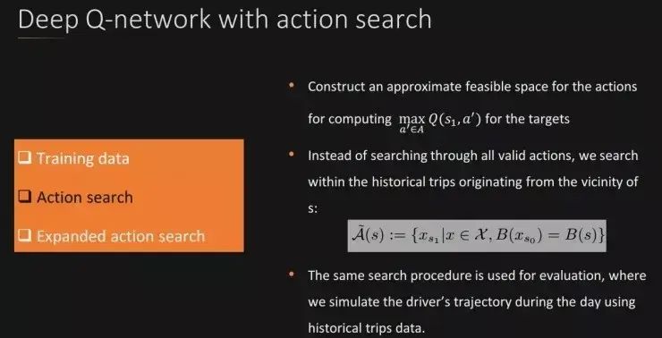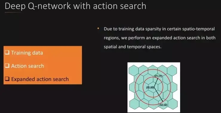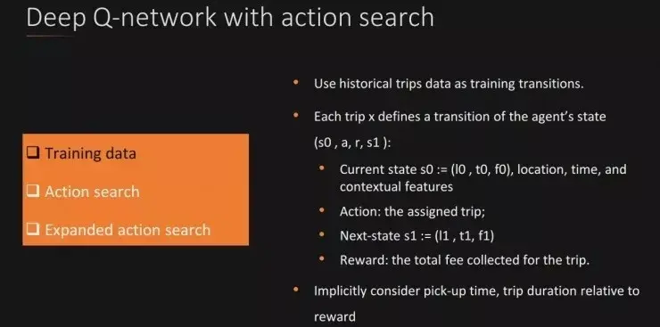 叶杰平教授介绍的第二种方法是深度强化学习,深度强化学习在应用中具有如下几个优点,一是对于实时供需变换具有良好的适应性,二是可以学习不同城市和时间段的数据,三是由于输入(上车地点、时间、目的地、内容)权重共享,所有泛化能力强。具体使用的深度强化学习模型是带有行动搜索的 DQN(Deep Q-network)模型。训练过程如下所示。