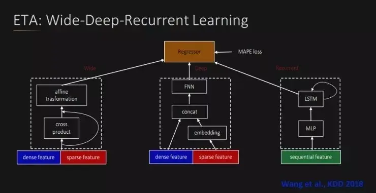 为了更高效的提供服务,基于 Dijkstra 的改进算法 Contraction Hierarchies 也是目前业界的主流解决方法。ETA 服务可以应用于多项任务,比如估计到达时间,估计未来行驶时间,提供数字地图/导航的基础服务。滴滴自 2015 年自主研发了 ETA 的机器学习解决方案,经过了不断的更新迭代,目前主要使用深度神经网络的方法,并且设计了针对性的深度神经网络-宽深循环学习(Wide-Deep-Recurrent Learning),进一步提升了预估精度。相关算法实践也被写入《Learning to Estimate the Travel Time》论文,被国际数据挖掘领域顶级会议 KDD 2018 收录。