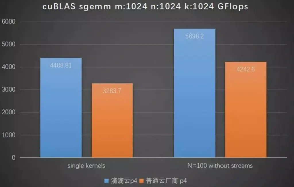 在此,简单评估一下滴滴云P4产品的单精度矩阵矩阵乘,sgemm的性能。所用实现为目前比较高效的Nvidia cuBlas实现。测试程序选择了CUDA 8 Samples内 batchCUBLAS。测试中对比了某普通云厂商的ecs.gn5i-c2g1.large产品,这款产品同样配置了2个CPU以及1个P4 GPU。