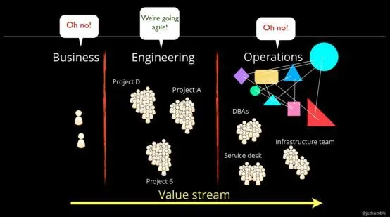 传统软件交付方式的问题大家都清楚,比如很长的交付周期、很差的应变能力和低效的价值交付。所有很多组织进行了敏捷转型,但敏捷转型的历程可能也并不是一帆风顺。以开发为代表的工程师部门使用敏捷的方式运作,从瀑布转向了Scrum快速迭代,并引入了TDD,做好了架构解耦,工作非常开心。