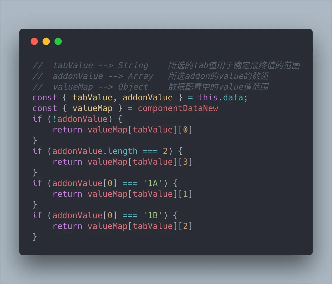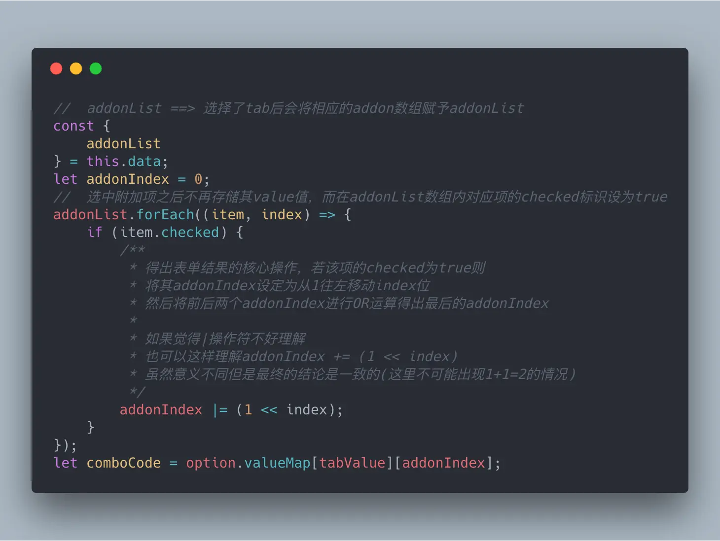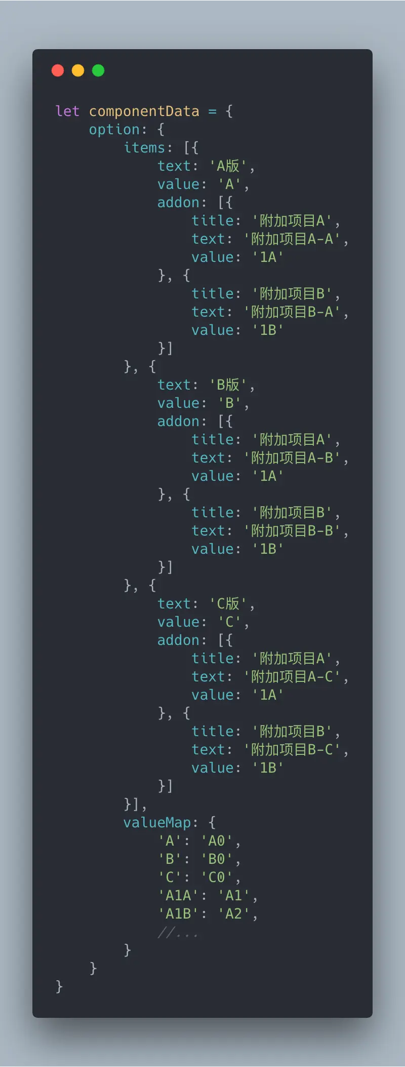 通过这种方案,我们可以在完全不关心addonList中的项个数或是每项值的情况下,得出我们想要的组合以及取到该组合对应的值,在我们配置项目的时候只需要留心每个value的顺序即可,无论配置多少项对前端的逻辑也不会产生影响。