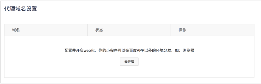 这步操作需要在智能小程序平台进行,进入小程序首页,单击“设置>开发设置”。找到“代理域名设置”中,单击“去开启”按钮,在弹出的对话框中,依次配置“小程序域名”和“H5域名”就可以啦。