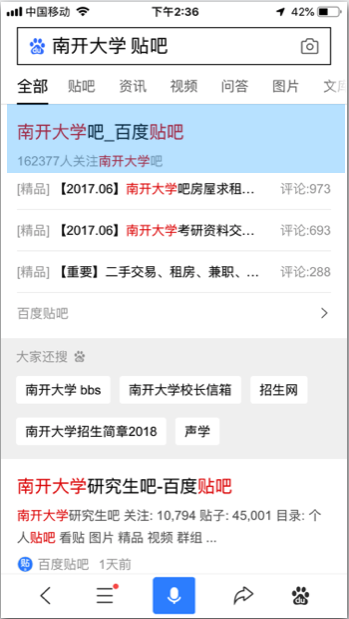 2. 如在百度App搜索框中输入“南开大学 贴吧”,在召回的自然结果中,点击百度贴吧相关的搜索结果,即可打开百度贴吧智能小程序,并进入“南开大学吧”主页。