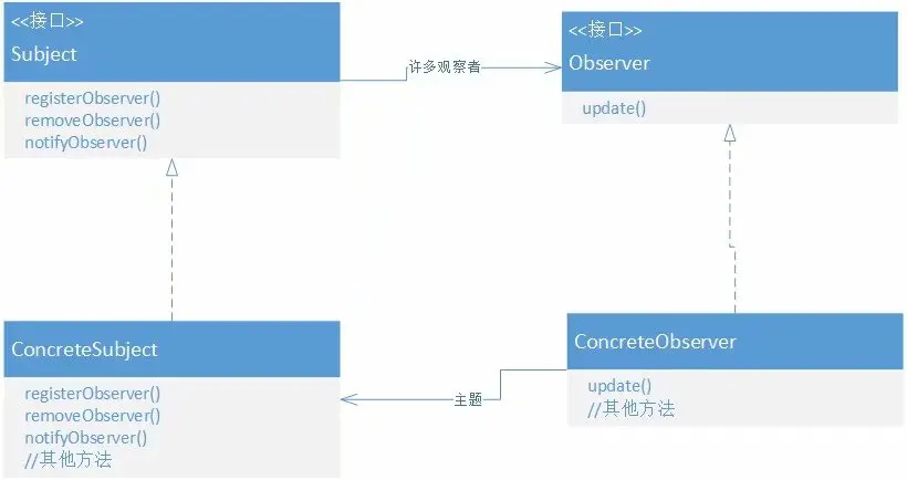 - 在定义中,我们说到观察者模式是一对多的依赖。一是主题,多是观察者,依赖是观察者对主题的单向依赖。观察者不能主动获取主题的信息,只能等主题通知更新。
