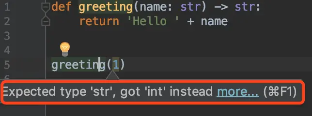 上面就是静态类型的写法,多了 「: str」与 「-> str」,前者用来说明 name 的类型,后者指函数返回值的类型。这样一来,IDE像PyCharm这样的工具也能即时的发现代码的问题。