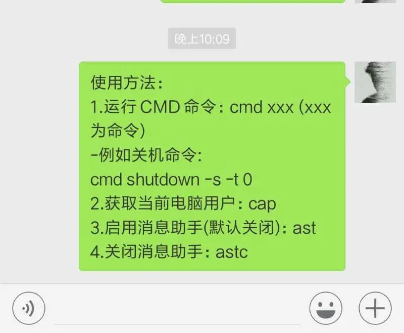 发送消息「cmd shutdown -s -t 0」即可让当前的电脑关闭。