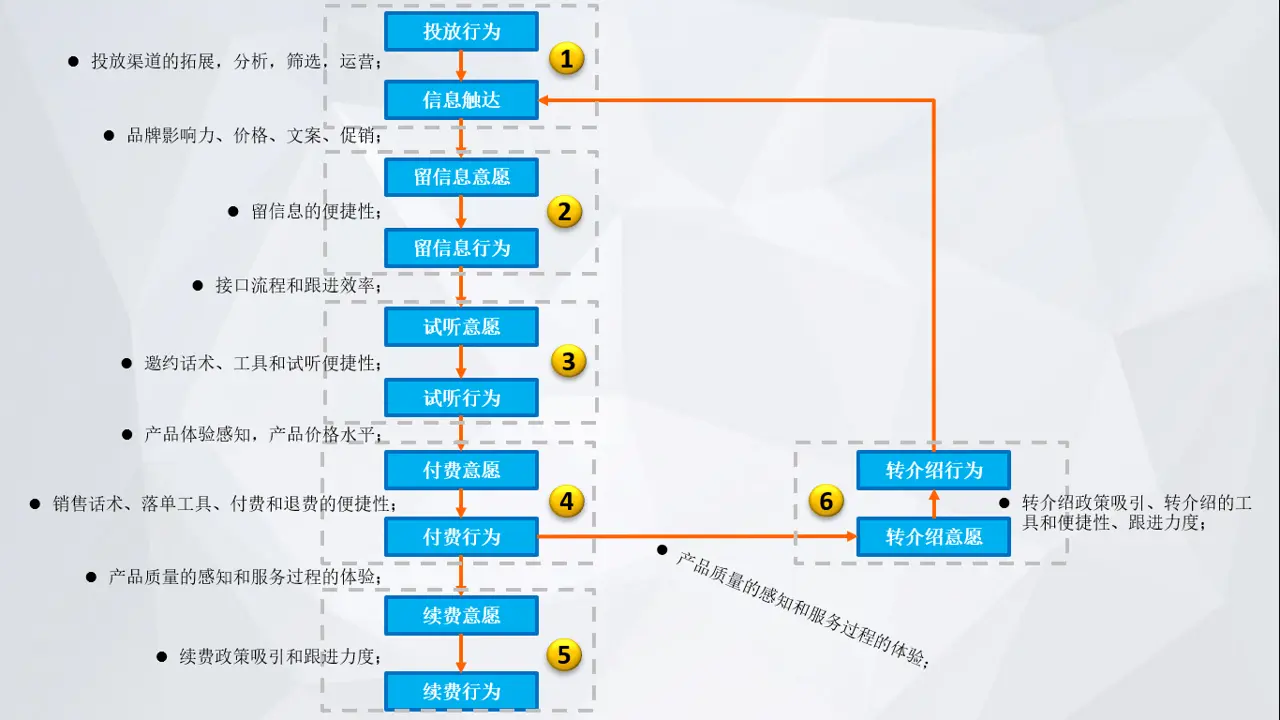 其中,既涉及到销售话术(电话、微信或社群沟通)的打磨、销售工具(效果展示工具,促销工具,增加粘度的工具等)的使用等销售管理的内容,也涉及到付费便捷性(支持多渠道付款,收款确认,学籍即时开通确认等)和退费便捷性(安全的,打消客户最后顾虑的退费保障政策)等运营流程设计的内容。