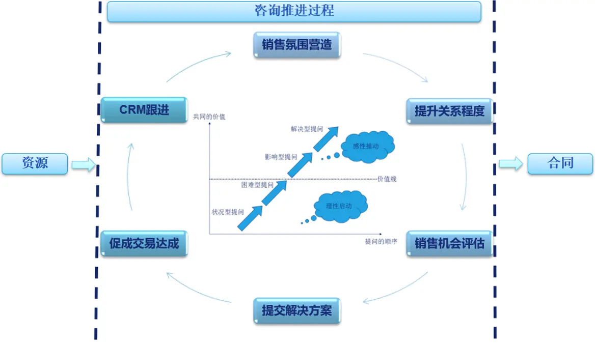1. 邀约话术和工具的水平。严格意义上,一个完整的从初次接触客户到最终成单的沟通推进,分为以下几个核心过程。