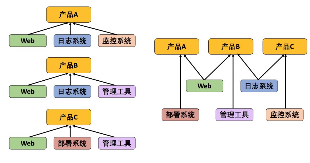 如上图所示,从 3 个产品各自独立维护 3 个它们所需的工具 (有重复),到 5 个工具共同支持 3 个产品,需要花费的精力从 9 个单位变成 5 个单位,从某种意义上来说,效率就从 5 个单位提升到 9 个单位。