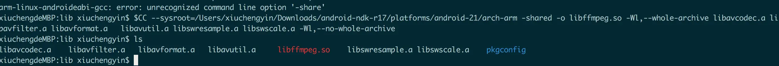 $CC --sysroot=/Users/xiuchengyin/Downloads/android-ndk-r17/platforms/android-21/arch-arm -shared -o libffmpeg.so -Wl,--whole-archive libavcodec.a libavfilter.a libavformat.a libavutil.a libswresample.a libswscale.a -Wl,--no-whole-archive