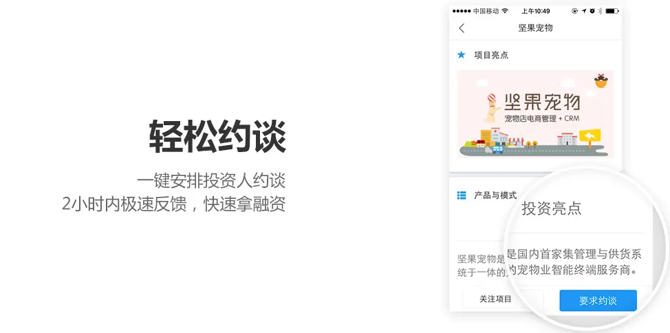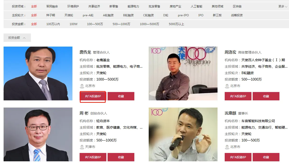 创业邦这个创业融资平台,在投资人,创业项目界面分别有关注及加入对比的按钮,点击之后对方可以知道,他对你是感兴趣的。在APP端投资人也是可以主动要求约谈创业者的。