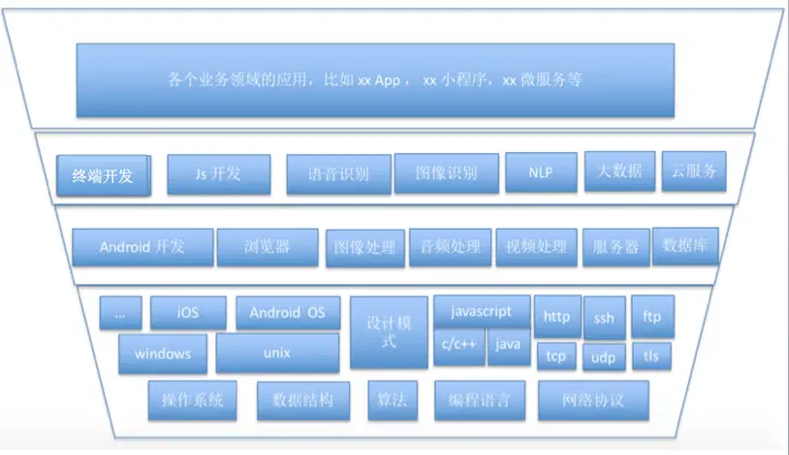 从上到下衰竭周期越长,从下到上变化越多同时短期内的需求越多。长远来看,越是底层的东西越值得我们去研究,底层的搞明白了,上层变化再多都能很快上手,以不变应万变。以上图片是我个人 YY 的,一定不全面,但能表达一个意思:技术服务业务, 越是上层的技术越受制于业务,业务千变万化,上层的技术形态也就千变万化。