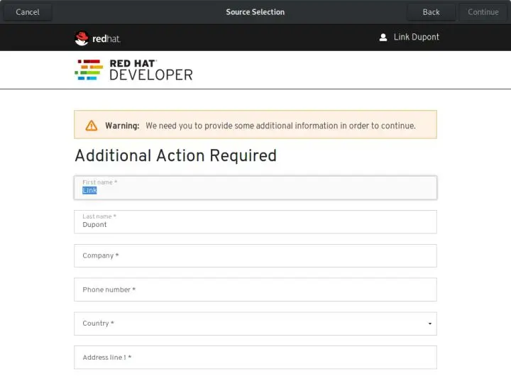 单击“注册”按钮,然后按照注册助手中的步骤操作。 出现提示时,使用你的红帽开发者帐户登录。
