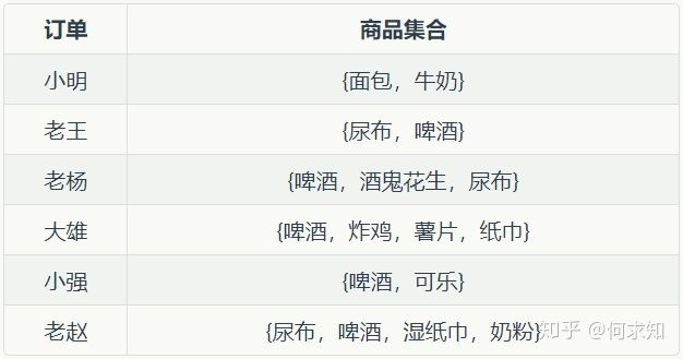 购物篮分析可以用下图简单说明:表格中有五笔订单,每笔订单包含若干商品(无先后顺序),比如第一笔订单表示小明同时购买了面包&牛奶。