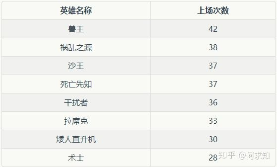 - 如果Support阈值定的太高,通常只能筛选出由「常见英雄(上场次数多)」构成的关联规则,导致无法获得由「不常见英雄」组成的关联规则。比如上图选择的Support阈值为0.039,挖掘出的关联规则包含:兽王、术士、萨尔、死亡先知、拉希克等英雄。这些英雄全部是本次SuperMajor的热门英雄(下图展示了本届比赛上场次数排名top8的英雄)。而{小精灵(学名:艾欧)->火猫(学名:灰烬之灵)}(Support=0.019)这种不常见英雄构成的关联规则就丢失了。