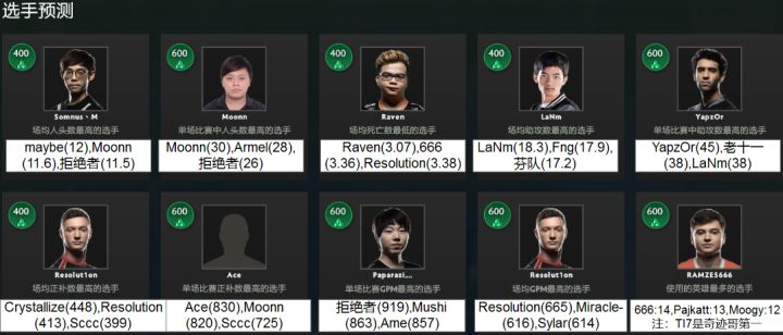 - 平均指标题目,请重点判断某些英雄的上场次数能否超过五次。比如赏金如果能上五次,则有很大几率拿下「场均助攻最高」;而当前版本不算太强势的 SF,如果被强队打弱队时多选几次,则有很大机会同时拿下「场均人头数最高」和「场均 XPM 最高」。