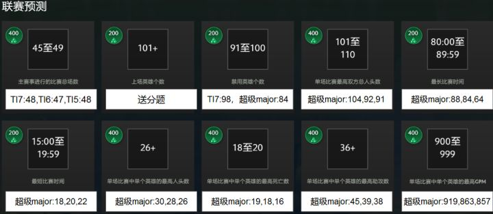 - 主赛事总场数历年都是 47~48 场,很容易做选择;上场英雄 101+ 是送分题(我们 DOTA2 就是这么优秀)。